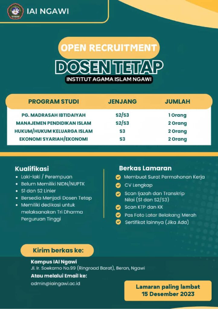 IAI Ngawi mengundang para akademisi dan praktisi pendidikan Islam yang berkompeten dan berkomitmen untuk bergabung memperkuat tim pengajar di lingkungan kampus.